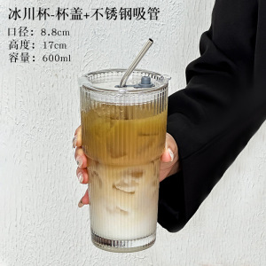 高颜值冷饮杯果汁咖啡杯带盖带吸管竖条纹玻璃杯水杯ins风大容量