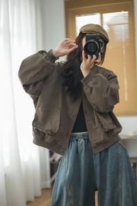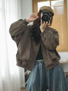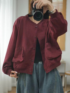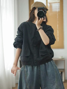 复古外套女 2025秋季大口袋设计单排扣圆领长袖开衫休闲外搭上衣