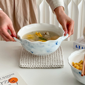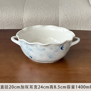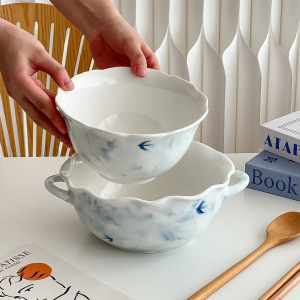 穆尼 ins水墨飞燕手绘釉下彩陶瓷碗高颜值双耳水果碗面碗菜碗汤碗