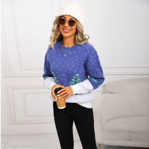 秋冬新款蓝色毛衣提花长袖圆领圣诞针织衫新年圣诞树套头休闲毛衣