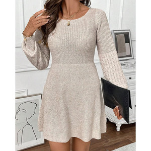 欧美跨境新款秋冬针织衫女装 宽松高腰A字裙摆圆领套头毛衣连衣裙