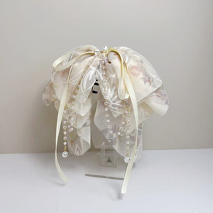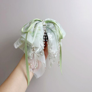 新中式印花蝴蝶结飘带发夹女新款珍珠流苏马尾抓夹半扎发鲨鱼夹子