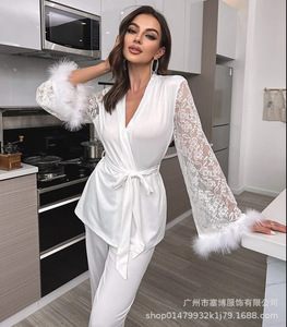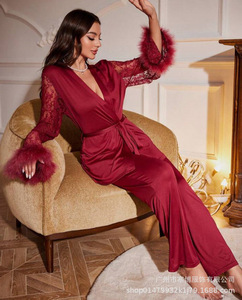 2025亚马逊跨境新款拼接蕾丝v领睡衣睡袍套装欧美v领睡衣睡袍套装