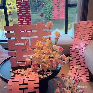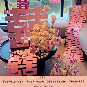 【主图同款】粉色婚房花喜字摆件4件套