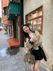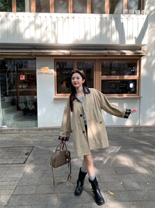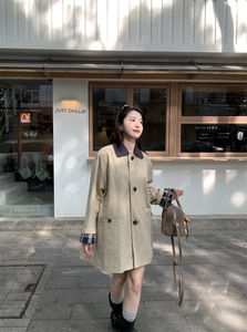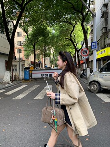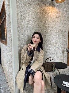 意法2025设计感格纹拼接风衣外套女装秋季复古宽松翻领中长款大衣