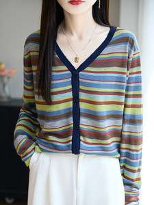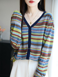 复古撞色条纹休闲薄款针织衫女韩系慵懒风洋气百搭宽松长袖上衣