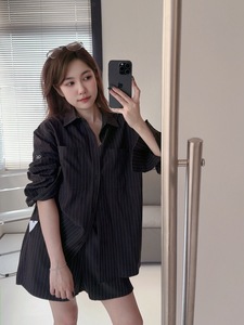 alo新款休闲条纹长袖衬衫短裤套装女百搭宽松显瘦简约优雅慵懒风