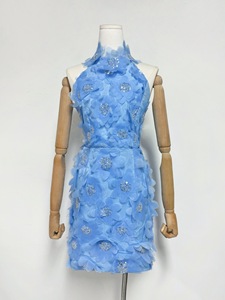 2025新款气质优雅连衣裙挂脖复古亮片立体花朵收腰露背修身短裙