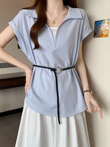 大码女夏季蓝色条纹假两件短袖衬衫胖mm显瘦遮肚收腰法式漂亮上衣