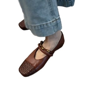 羊皮版~法式编织一字带玛丽珍鞋女2025新款方头百搭平底浅口单鞋