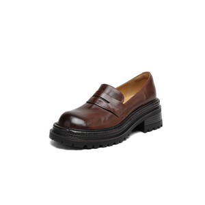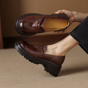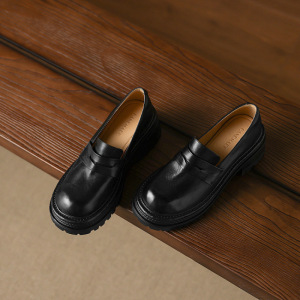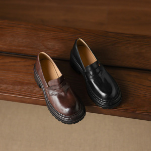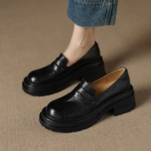 秋款复古厚底小皮鞋女一脚蹬圆头深口单鞋通勤粗跟高跟黑色乐福鞋