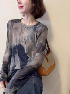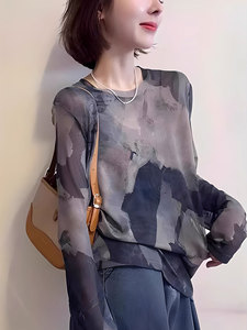 别致国风水墨扎染长袖网纱上衣夏季新款冰丝凉感防晒罩衫显瘦T恤