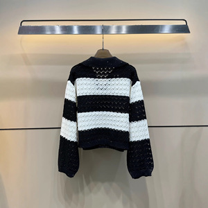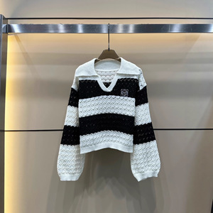 25早秋新款慵懒感黑白拼色烫钻logo镂空V领针织长袖