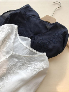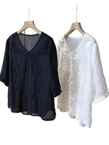 精致日系~气质V领100%苎麻刺绣花朵宽松休闲简约薄款衬衫G073002