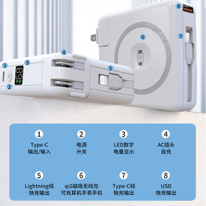 跨境qi2自带线PD20W快充ac带插头10000毫安半固态电池磁吸充电宝