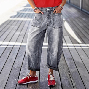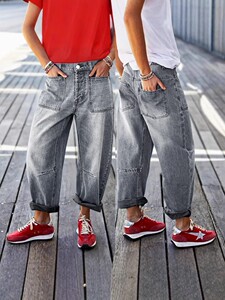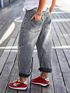 欧美跨境亚马逊TEMU弹力中腰黑灰色牛仔裤卷边穿法中腰九分牛仔裤