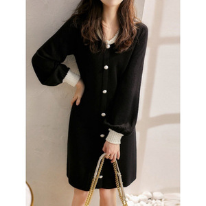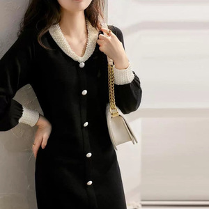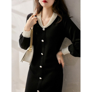 6944小香风轻奢高端女神范珍珠扣连衣裙秋新款V领显瘦黑色针织裙
