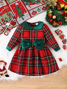 圣诞节2025新款女童连衣裙娃娃领长袖大蝴蝶结童裙格子裙