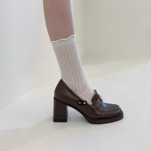 ins韩版!显腿长~!增高7.5CM山茶花圆头高跟鞋女单鞋乐福小皮鞋