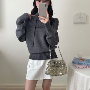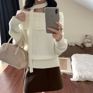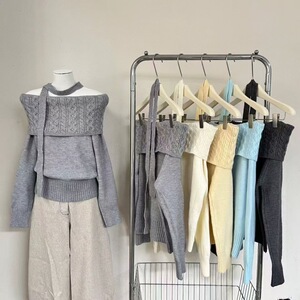 灰色麻花一字肩长袖毛衣针织衫女秋冬新款韩系软糯露肩纯欲风上衣