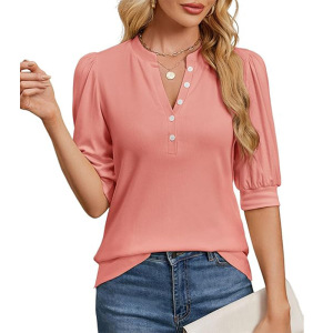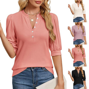 亚马逊Tiktoktemu2025新款欧美跨境女装 V领五分短袖纽扣纯色衬衫