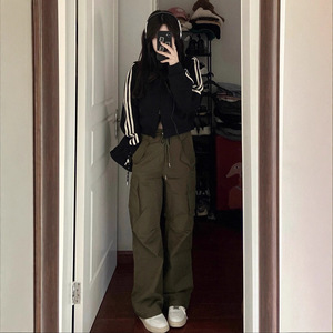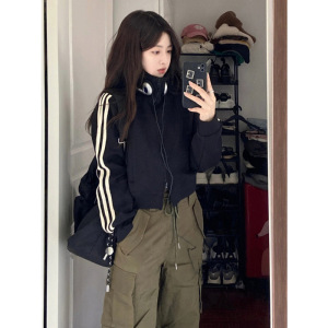 美式复古条纹短款运动卫衣女秋季修身立领长袖防晒外套黑色上衣潮