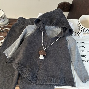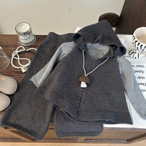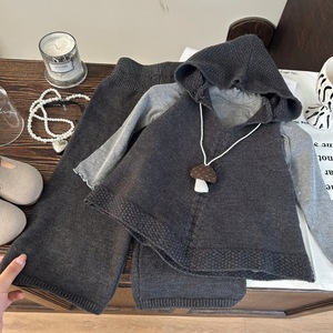 韩版童装2025新款秋季女童木耳边打底衫针织连帽马甲休闲裤三件套