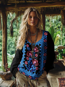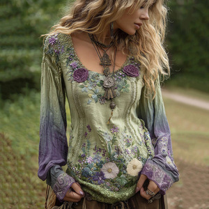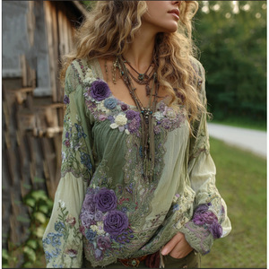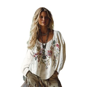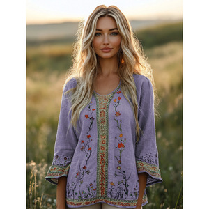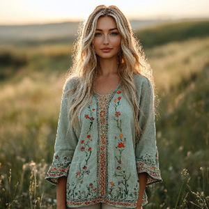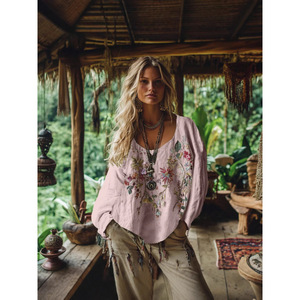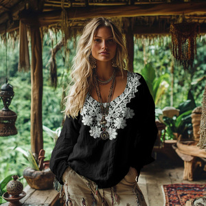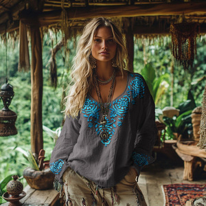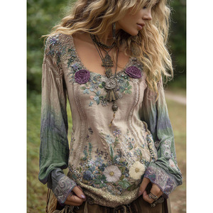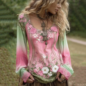 跨境独立站亚马逊新款热卖3D数码印花女士圆领复古波西米亚上衣