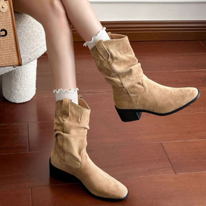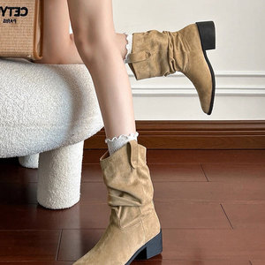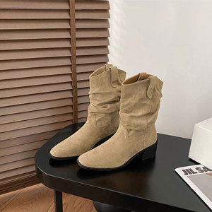 新款复古西部风牛仔靴美拉德圆头粗跟骑士短靴女褶皱堆堆靴子女夏