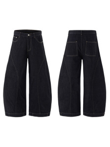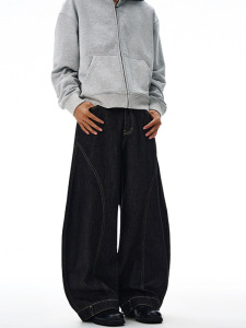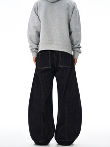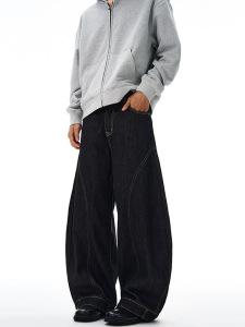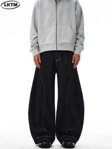 LKTM男装 美式复古原牛拼接弯刀牛仔裤男女cleanfit宽松廓形长裤