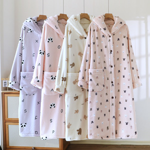 加厚玉兔法兰绒女士睡袍 中长款连帽睡裙保暖宽松浴袍家居服睡衣