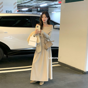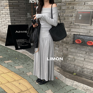 the limon柠檬绿茶2025秋季新款法式气质一字肩长袖连衣裙女长裙