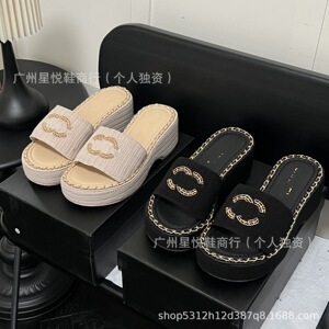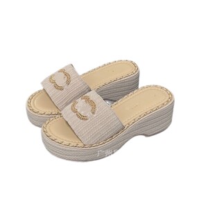 稥系列链条侧边一字凉拖女鞋2025年春夏季厚高跟亚麻编织圆头女鞋
