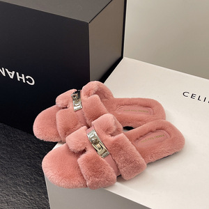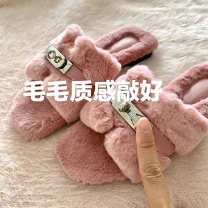 法式玫瑰粉~INS显白温柔仙女风毛毛拖鞋秋冬网红高级感毛绒一字拖