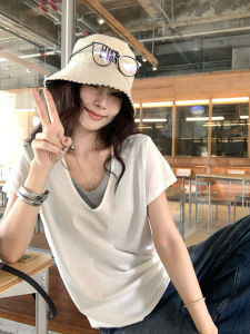 雪花棉v领假两件撞色短袖T恤女夏季设计感小众轻薄款宽松休闲上衣