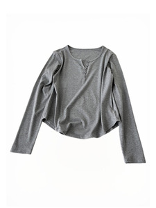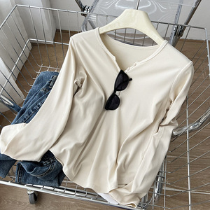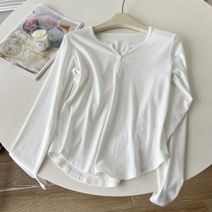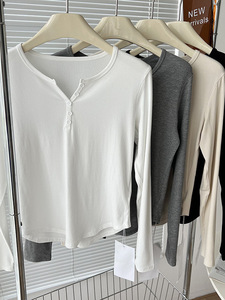 螺纹棉扣子V领长袖T恤女春秋新款修身显瘦坑条内搭打底衫百搭上衣