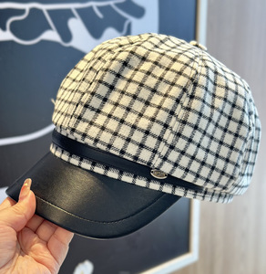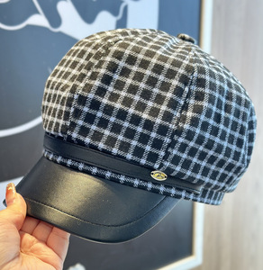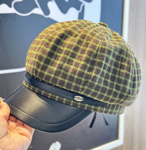 2025年新款格纹pu皮拼接八角帽子女格子复古显脸小百搭时髦鸭舌帽