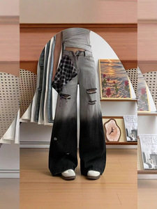 美式复古渐变色破洞牛仔裤女2025夏季新款高腰显瘦拖地阔腿裤长裤