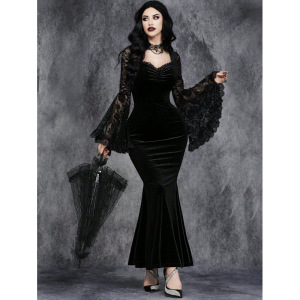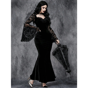 2025亚马逊独立站跨境万圣节哥特风蕾丝拼接收腰喇叭袖连衣裙