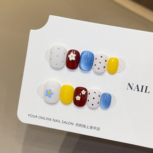 ins风法式波点猫眼手绘小花甲片短款显白纯手工穿戴甲手作假指甲