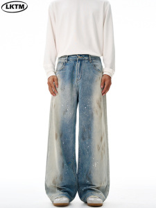 LKTM男装 美式潮牌手工泼墨做脏牛仔裤男女百搭baggy阔腿直筒长裤