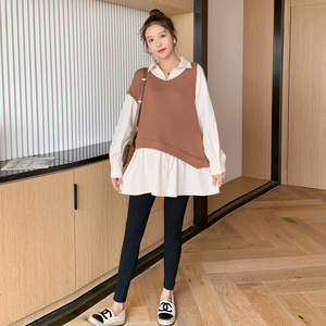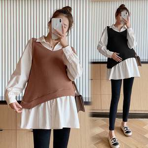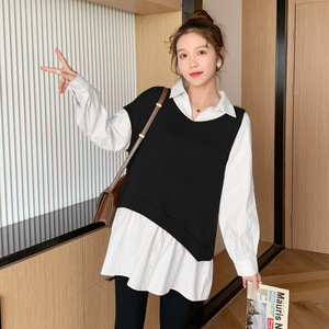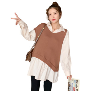 2025秋冬孕妇装撞色假两件百搭衬衣打底娃娃衫宽松孕妇上衣