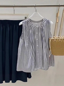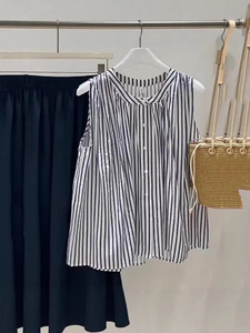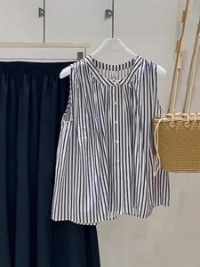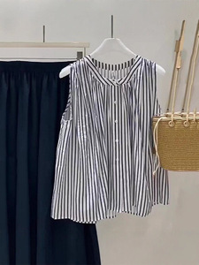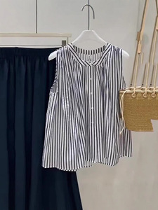 夏季新款文艺圆领复古条纹小个子无袖背心衬衫气质宽松衬衣女上衣