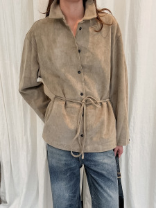 2025秋冬复古经典卡其色针织麂皮绒宽松休闲翻领收腰显瘦系带外套