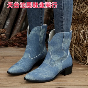 2025欧美时尚秋冬新款现货中跟女式皮靴外贸尖头大码西部牛仔女靴