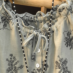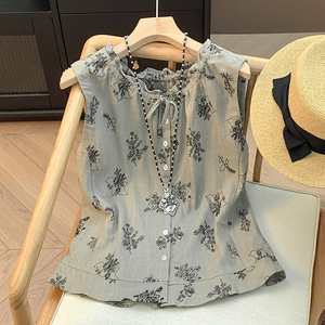 现货2025夏季薄款雨露麻艺术感植物印花减龄无袖系带衬衫小衫百搭