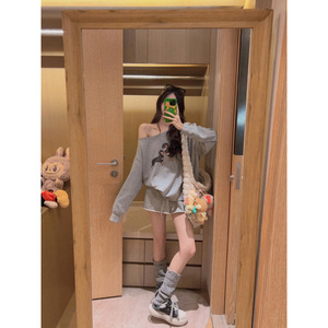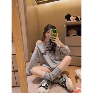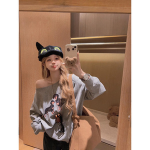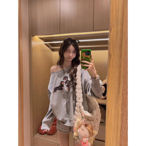 美式高街设计感斜肩卫衣女2025秋季新款宽松慵懒松弛感露肩上衣潮