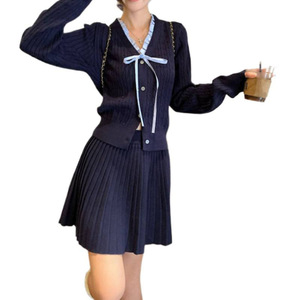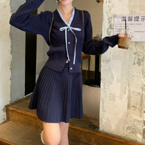 韩系学院风套装女木耳边拼接针织开衫上衣秋冬百褶裙半身裙两件套