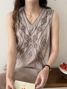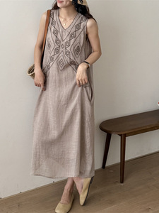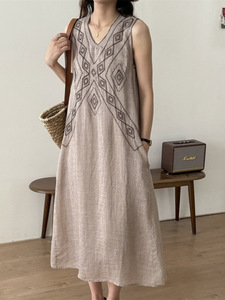 假日苎麻天丝无袖连衣裙2025年夏刺绣设计V领宽松显瘦复古长裙