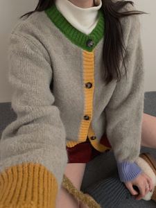 韩系撞色针织开衫多彩配色圆领单排扣甜美温柔秋冬百搭毛衣女外套